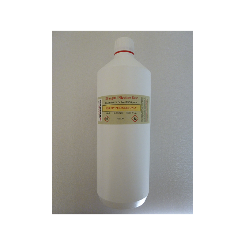 1 Litre of 100mg/ml USP Nicotine solution strength (10.0% Nicotine by weight) diluted in a USP grade carrier base fluid vegetable-derived Glycerin.